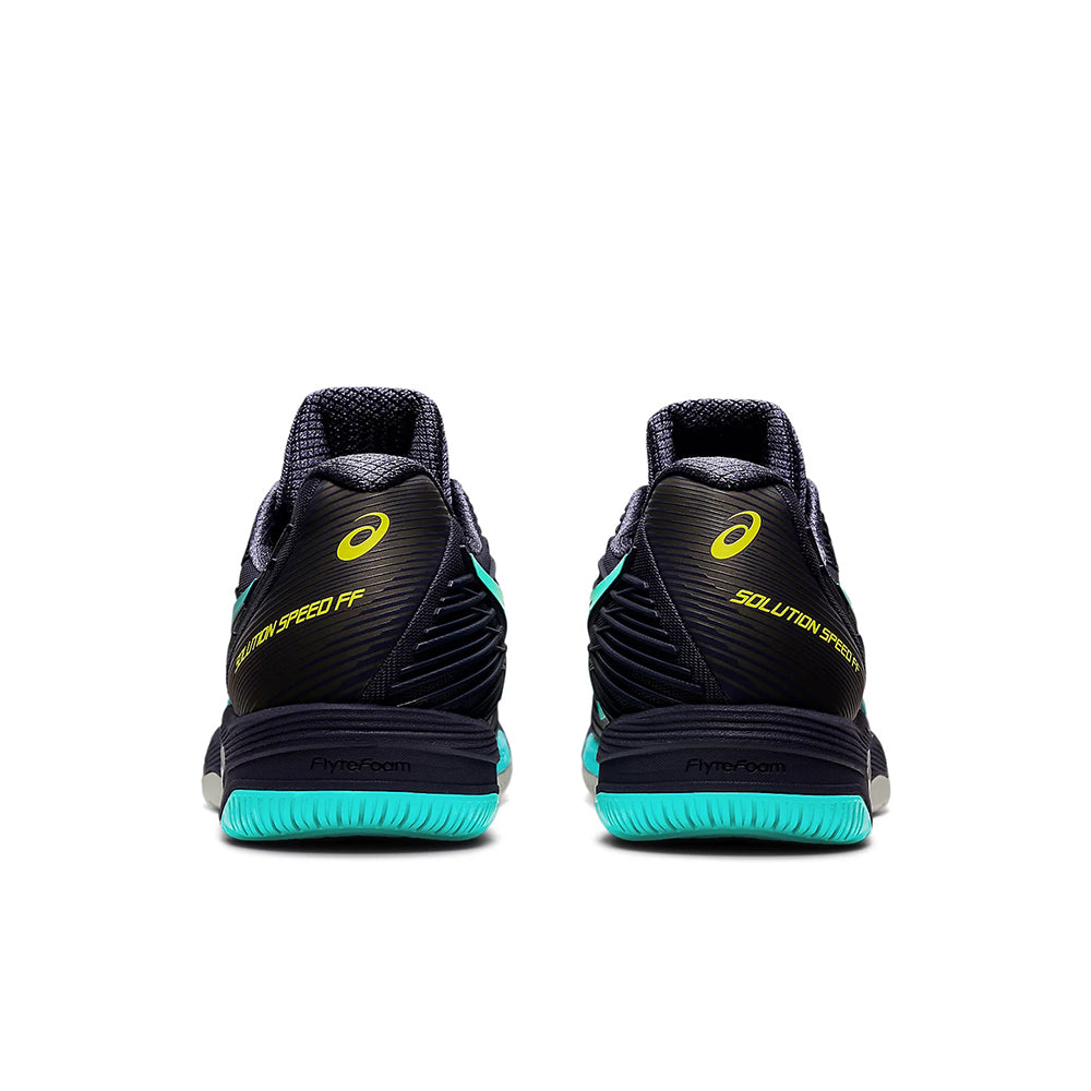 The fastest model in the ASICS tennis range, our SOLUTION SPEED™ FF 2 shoe is all about helping players expand their territory on the court. Combining better stability and a more flexible fit, this shoe is a recommended choice for athletes that are looking for quicker accelerations to be ahead of the ball. The SOLUTION SPEED™ FF 2 model features a PU (polyurethane) application on the upper that helps generate better support, flexibility, and an improved fit. Implementing DYNAWRAP technology into the eyestay, this application helps provide more stability in the forefoot during side-to-side movements. Additionally, the sockliner is produced with a solution dyeing process that reduces water usage by 33% and carbon emissions by approx. 45%. TWISSTRUSS™ technology in the midsole assists players who are regularly moving from the baseline to the net by improving their cutting motions and quick transitions. Providing a faster acceleration period between stops to full-sprints; this shoe is excellent for athletes who want to get to the ball swiftly and have more time to plan their shot with plenty of pace. Recognizing that the first step is usually the most important step during a point, we've also molded a new outsole design that offers better traction in the heel, forefoot and the toe section to help deliver faster forward transitions. Combining a responsive cushioning system with a more supportive upper and improved flexibility, the SOLUTION SPEED™ FF 2 shoe is an excellent choice for tennis athletes looking to expand their territory.